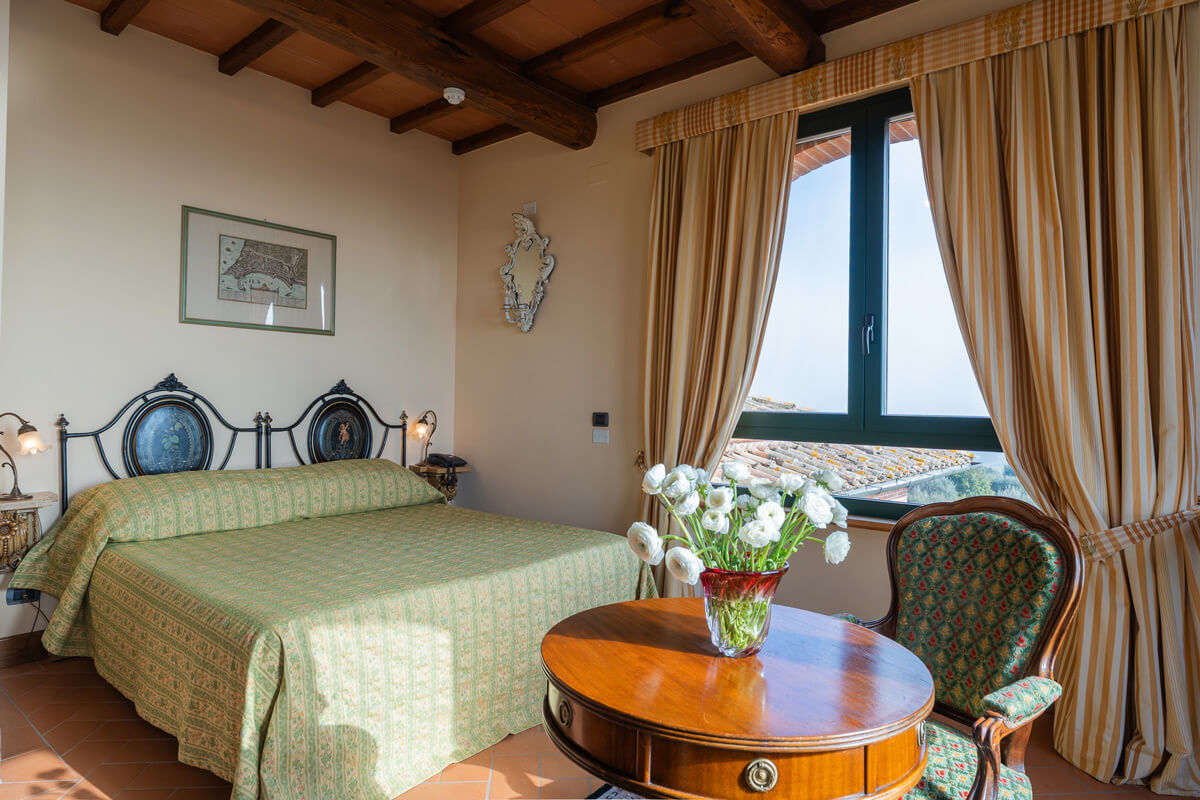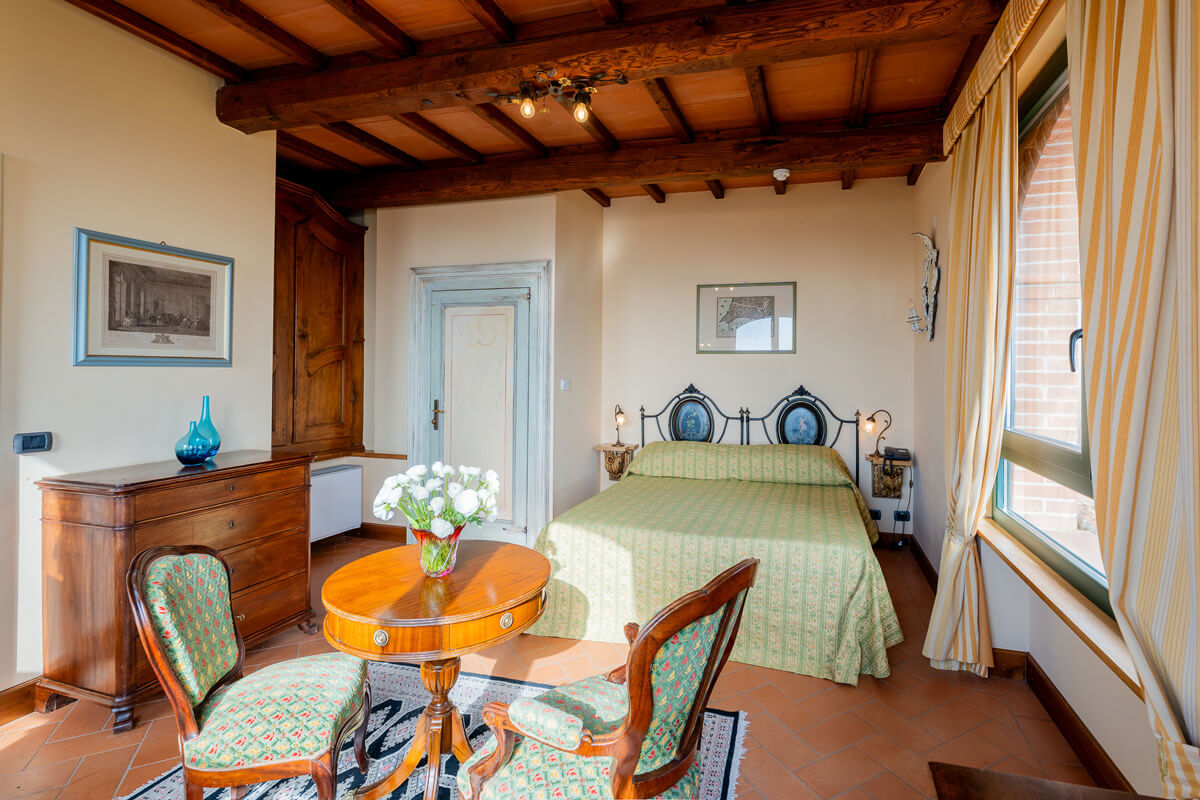 Elegante camera con due ampie vetrate vista sul parco con olivi secolari, sul lago e sulle dolci colline umbro toscane, raggiungibile con una scala di circa 15 gradini.