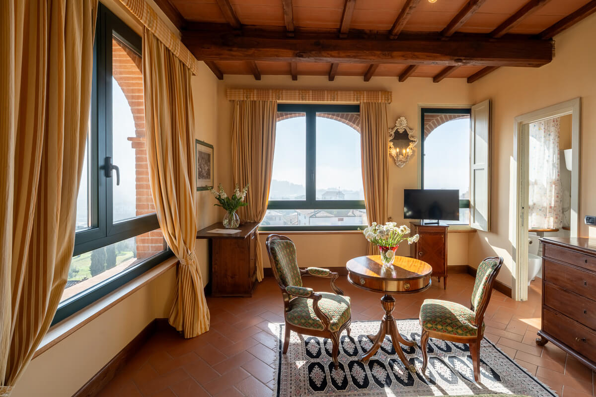 Elegante camera con due ampie vetrate vista sul parco con olivi secolari, sul lago e sulle dolci colline umbro toscane, raggiungibile con una scala di circa 15 gradini.